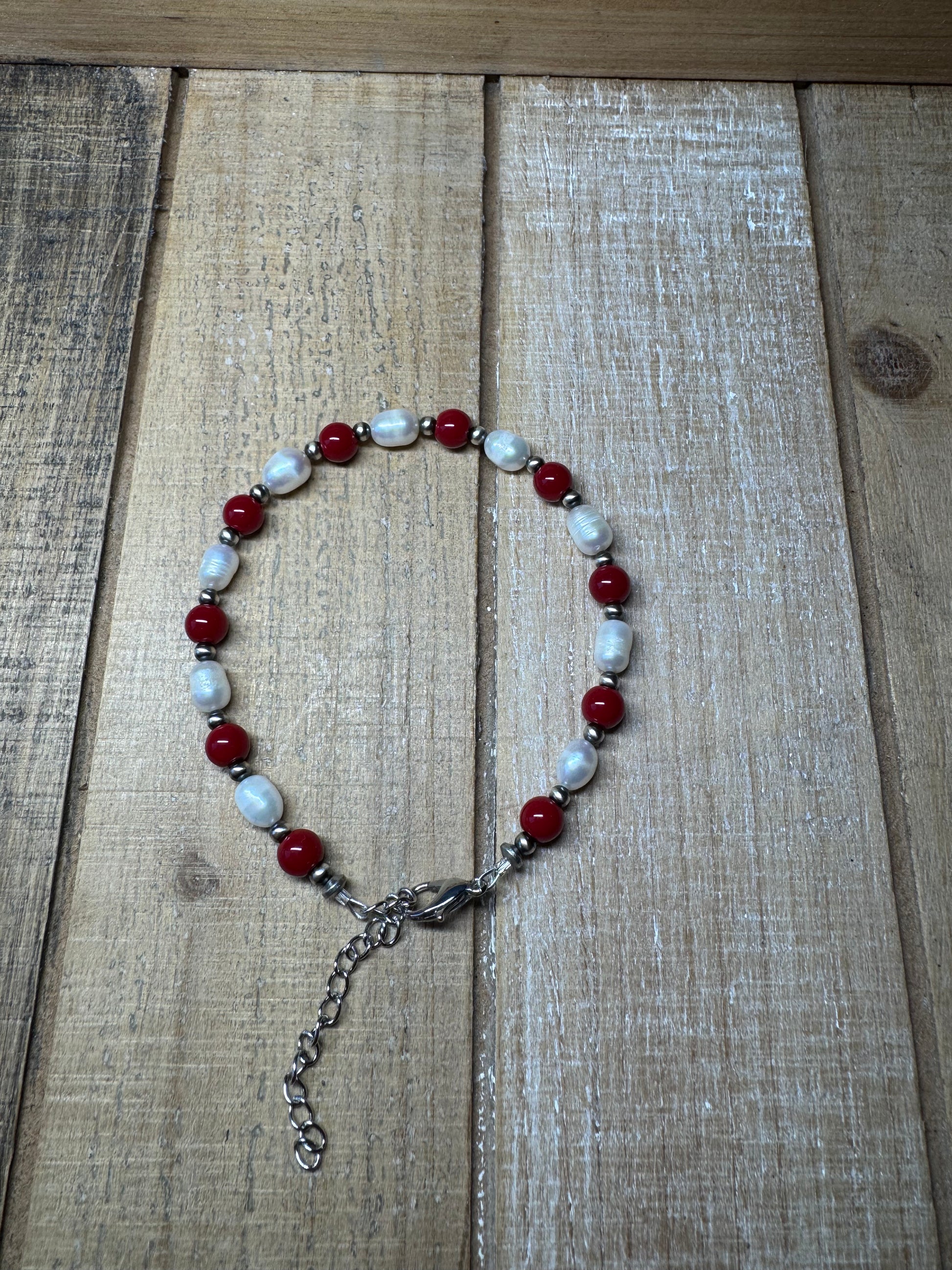 Bracelet with round red beads, freshwater pearls, and 3mm pearls