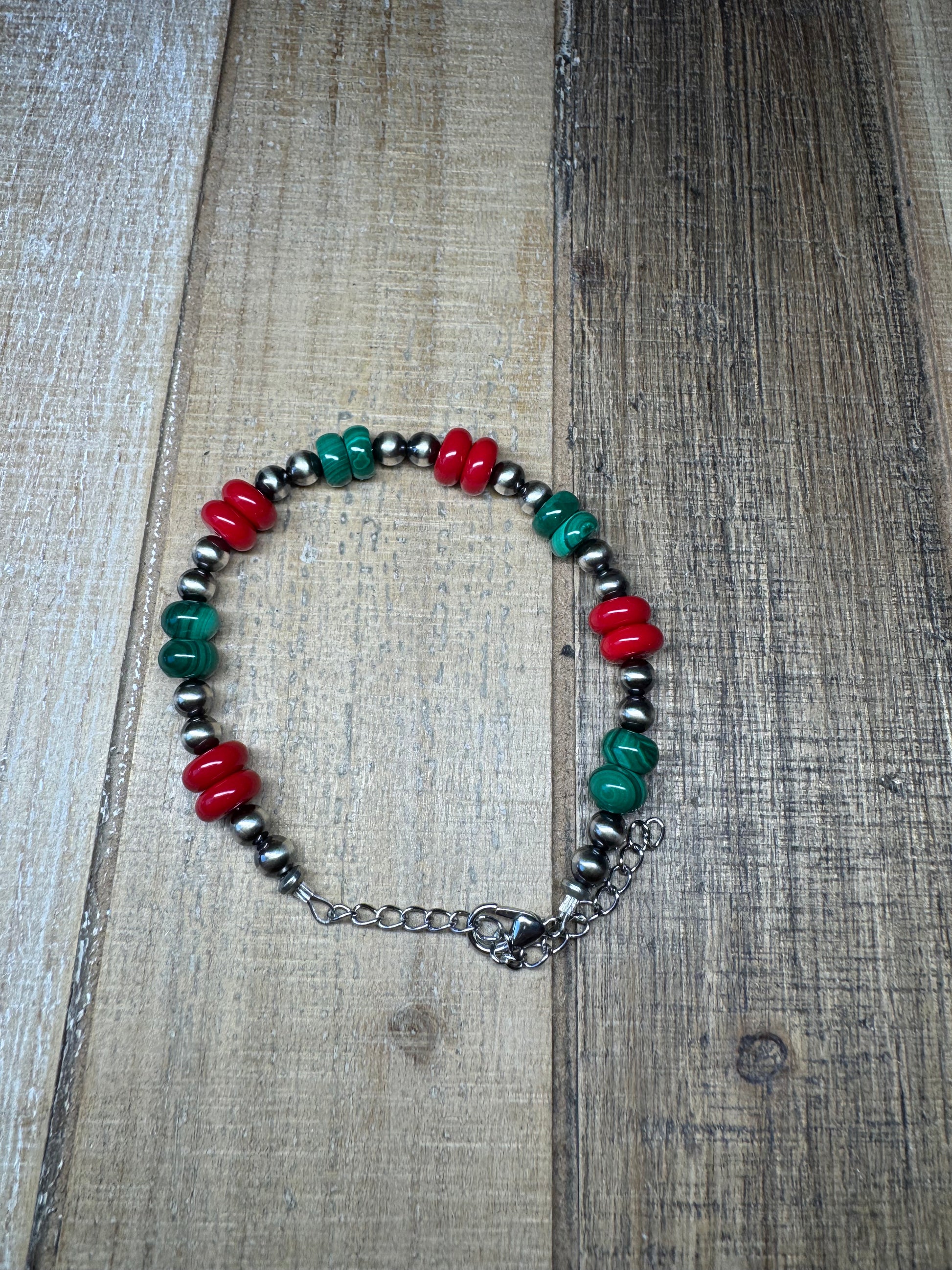 Malachite Rondelle, Red Rondelle, and 5mm pearls